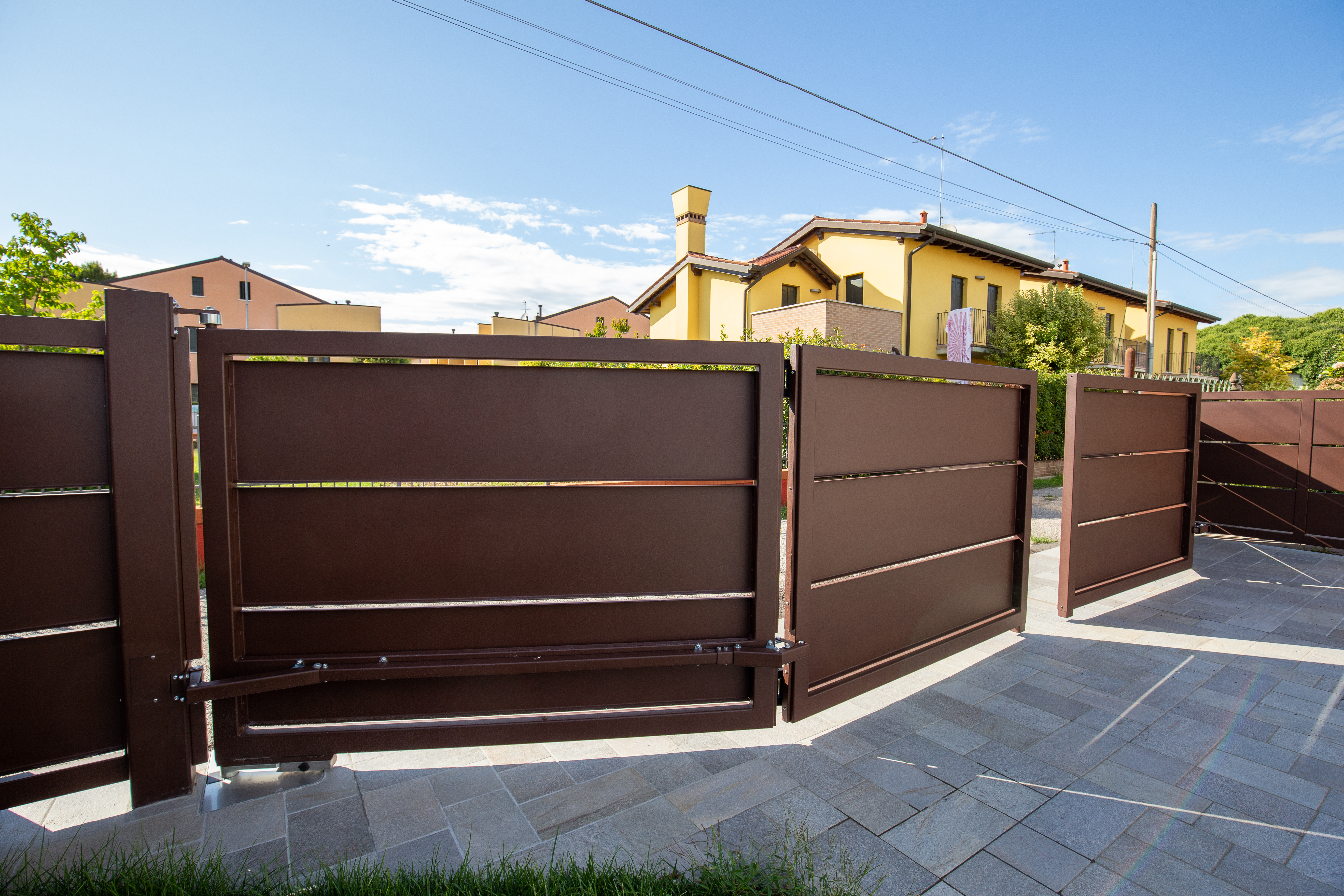 Installation of a two-leaf folding gate in industrial polo with BR21/351 underground motor installed on FU103 stainless steel casing with detail of mechanical articulated arms to adjust the opening